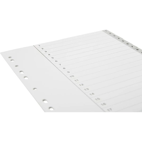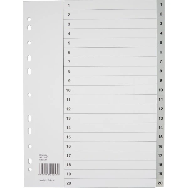 Super kvalitet til en god pris! Talregister, som er nummereret fra 1-20. Den er produceret i en smart PP-folie, og er i et smart design, hvor der er plads til rigelig tekst. Det behøver ikke at være dyrt eller besværligt at holde kontrol over dine mappers indhold med dette nummererede register til en fordelagtig pris. Få orden i dine brevordnere og ringbind. Registeret har plads til 20 forskellige emner, og du kan skrive emnerne på indholdssiden/forbladet i karton, som sættes forrest i mappen.