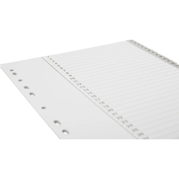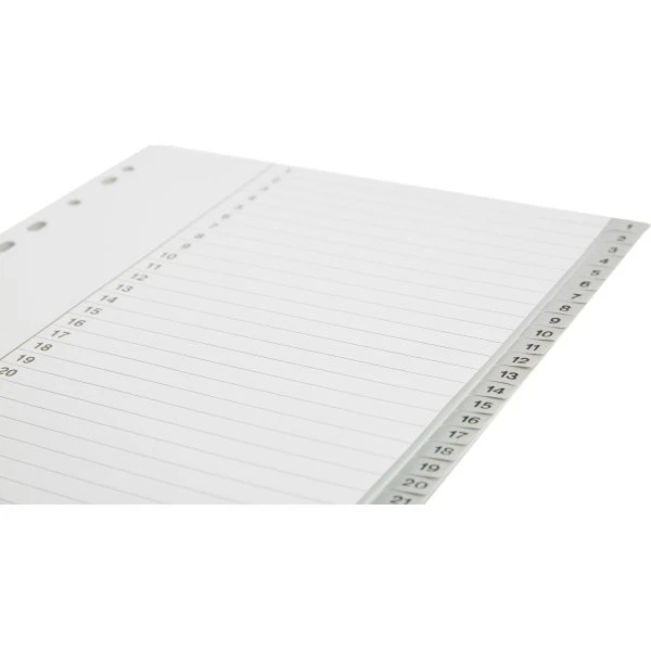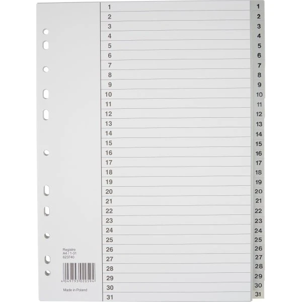 Super kvalitet til en god pris! Talregister, som er nummereret fra 1-31. Den er produceret i en smart PP-folie, og er i et smart design, hvor der er plads til rigelig tekst. Det behøver ikke at være dyrt eller besværligt at holde kontrol over dine mappers indhold med dette nummererede register til en fordelagtig pris. Få orden i dine brevordnere og ringbind. Registeret har plads til 31 forskellige emner, og du kan skrive emnerne på indholdssiden/forbladet i karton, som sættes forrest i mappen.