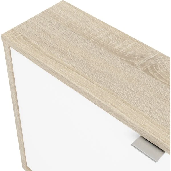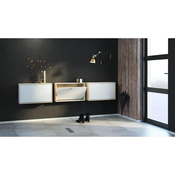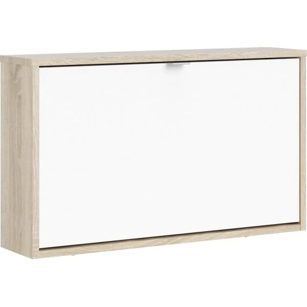 Flot og enkelt skoskab i eg og hvid med 1 rum, som gør det muligt at organisere og opbevare dine sko på pladsbesparende måde. Med den store klaplåge og det fine aluminiumsgreb får du et elegant og rummeligt skoskab med plads til 3 par sko. Skabet kan enten hænges på væggen eller stå direkte på gulvet, og er let at rengøre.