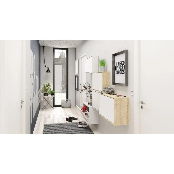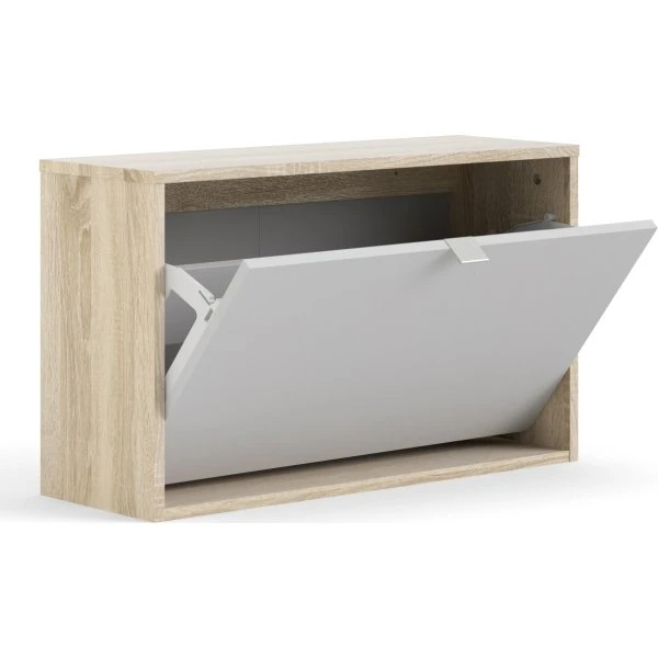 Flot og enkelt skoskab i eg og hvid med 2 rum og en justerbar hylde, som gør det muligt at organisere og opbevare dine sko på pladsbesparende måde. Med den store klaplåge og den fine aluminiumsgreb får du et elegant og rummeligt skoskab med plads til op til 6 par sko. På grund dybden på skoskabet er der plads til både støvler og de høje hæle. Skabet kan enten hænges på væggen eller stå direkte på gulvet, og er let at rengøre.