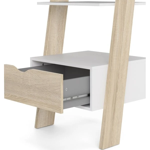 En enkel stigereol med vanger og skuffefront i eg, som giver en flot farvekontrast til de hvide hylder. Stigereolens hylder er i forskellige størrelser, hvor hylderne bliver bredere jo nærmere man kommer skuffen. Selve skuffen i eg og hvid, giver derfor mulighed for opbevaring både ovenpå og indeni. Da stigereolen ikke kan stå selv, skal lænes op ad en væg og monteres med de medfølgende beslag. Stigereolen er i et enkelt og minimalistisk design, som er nem at style for at give den et mere personligt præg.