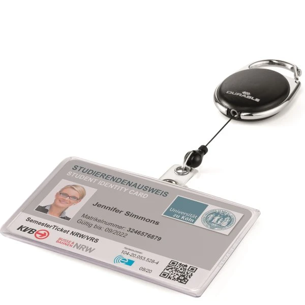 Med denne kortholder fra Durable får du en holder i let og fleksibelt materiale med plads til 1 kort. Med kortholderen medfølger en yoyo med plaststrop og trykknap.