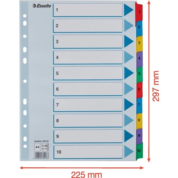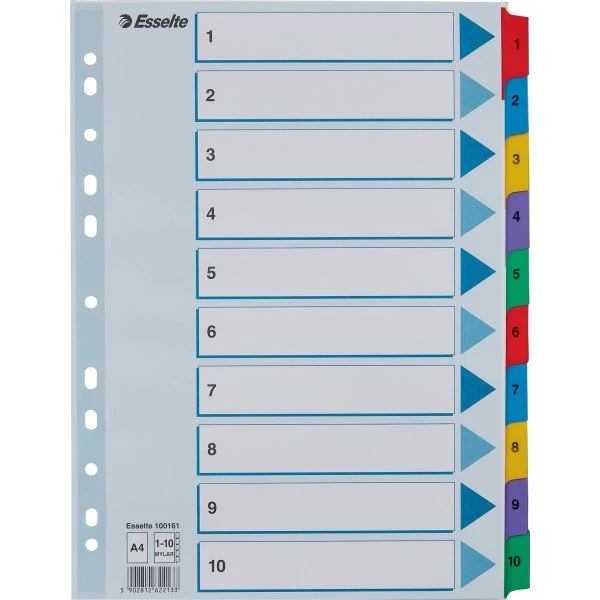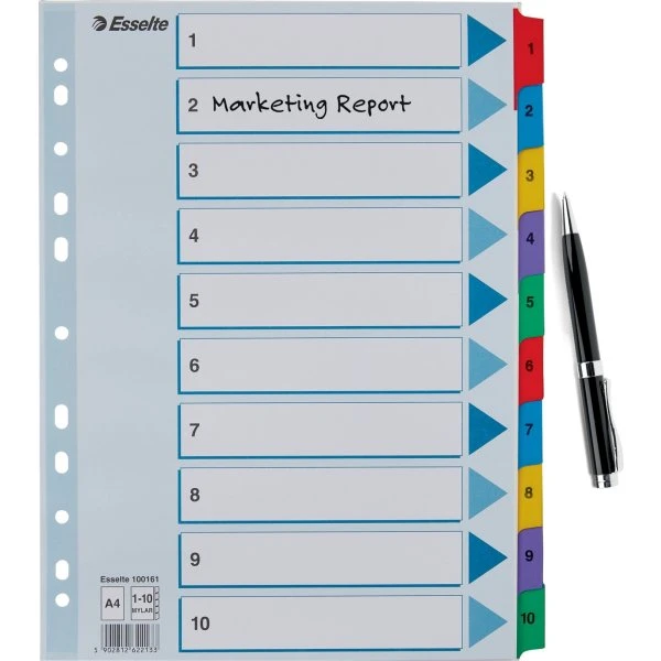 Stærk hvid karton med tryk i flere farver. Fanerne er forstærket med plastfolie.