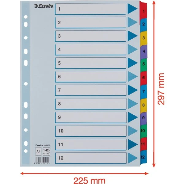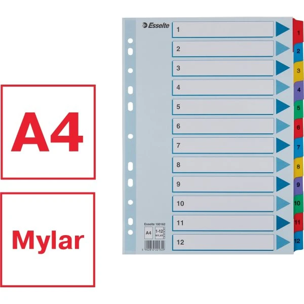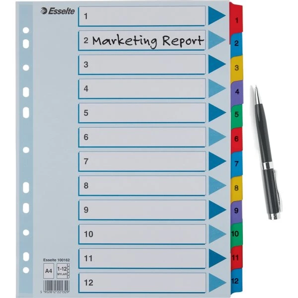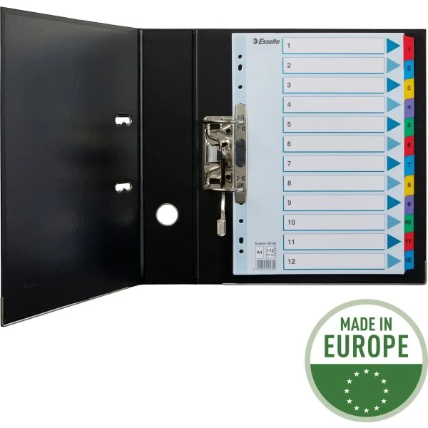 Stærk hvid karton med tryk i flere farver. Fanerne er forstærket med plastfolie.