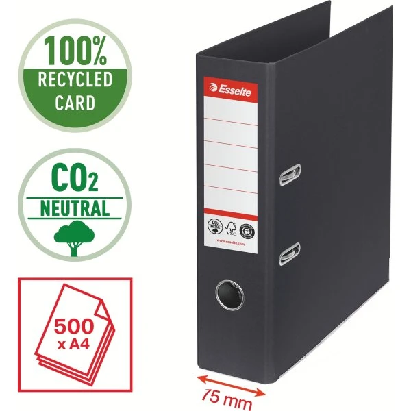 Brevordneren har en rygbredde på 75 mm, og kan holde op til 500 A4 ark, og kan samtidig med fordel bruges sammen med andre produkter fra Esselte som Esselte Recycled plastlommer og omslag.