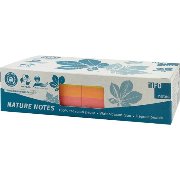 Med iNFO Nature notes får du ikke bare memoblokke produceret i 100% genanvendt papir, men selv emballagen er produceret i genanvendte materialer. Blokkene leveres i flotte kartonner uden plastindpakning.