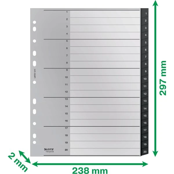 Recycle registeret er et holdbart register i tynd PP-plast med 20 numeriske faneblade med tryk 1-20, for en klar og tydelig organisering af dine A4-papirer, dokumenter og øvrige materialer. Registeret hjælper med at holde styr på vigtige noter og emner og er velegnet til brug i hjemmet, på skolen eller på kontoret.