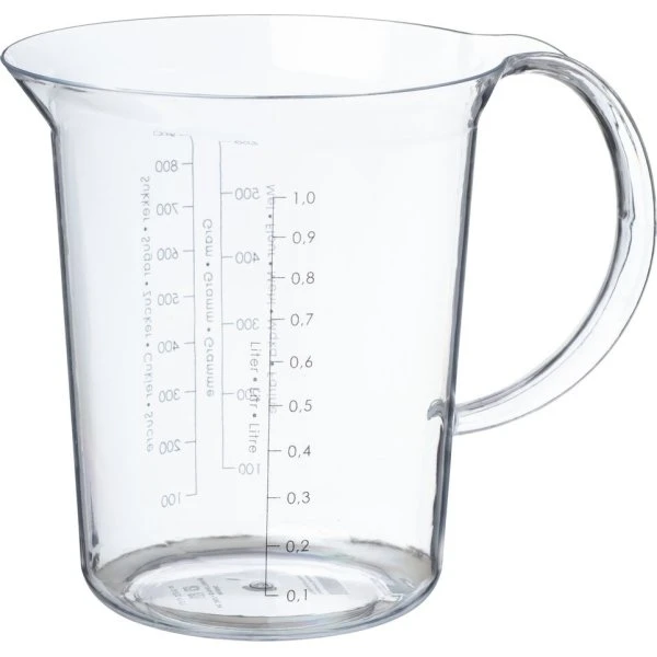 En målekande er et klassisk redskab i køkkenet til bagning og madlavning. Målebægeret er yderst anvendelig til korrekt afmåling af ingredienser, da kanden har 3 har en praktisk 3-delt måleskala som angiver både litermål, samt afmåling af gram for henholdsvis mel og sukker. Dertil er måleenhederne angivet på 5 forskellige sprog. Praktisk tilbehør til køkkenet, som er let håndterbart, og endvidere er nemt at vaske af.