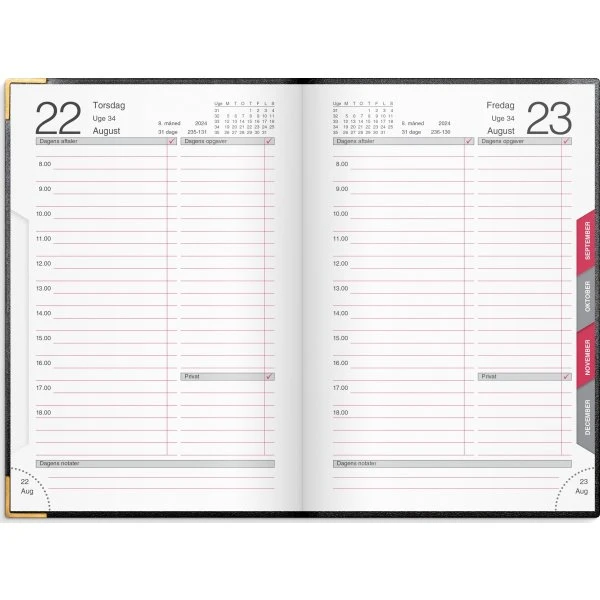 Du får her en årbog for året 2024 med mærkebånd og månedsfaner. Kalenderen er inddelt med en dag pr. side og indeholder et timeopdelt kalenderskema fra kl. 8-18, så du nemt kan danne dig et overblik over dagens planer og aktiviteter. Dertil er årbogen yderst struktureret med plads til at notere dagens aftaler, opgaver og private ærinder.