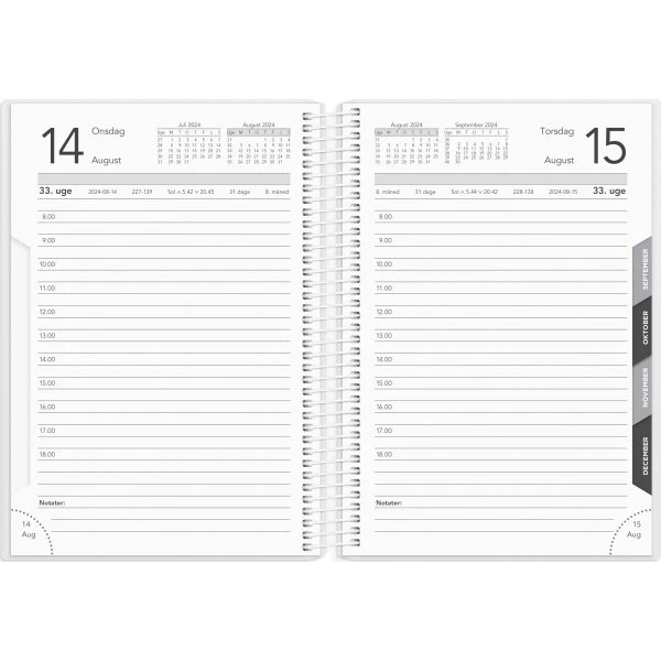 Du får her en simpel dagskalender i et enkelt design for året 2024. Basiskalenderen er inddelt med en dag pr. side og indeholder et timeopdelt kalenderskema fra kl. 8-18, så du nemt kan overskue dagens planer og aktiviteter. Dertil finder du plads til dagens noter nederst på hver side, en månedsoversigt ved hver måneds start samt afrivningshjørner, så du hurtigt og nemt kan slå op på dagens side.