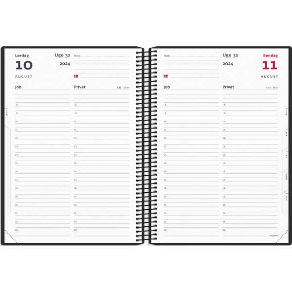 Du får her en smart og funktionel dagkalender for året 2024, hvor du nemt kan holde styr på både dine jobrelaterede og private aftaler. Kalenderen er inddelt med en dag pr. side og hver dag er opdelt i 2 kolonner – en til job og en til privat. Dagkalenderen indeholder et timeopdelt kalenderskema fra kl. 8-23 i hver kolonne, så du på den måde kan sikre dig et overblik over dagens aktiviteter.