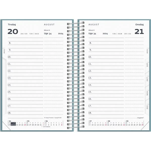 Du får her en smart, mini kalender med blå forside for året 2024. Kalenderen er inddelt med en dag pr. side og indeholder et timeopdelt kalenderskema fra kl. 8-18, så du nemt kan overskue dagens planer og aktiviteter. Dertil finder du en tidslinje og månedsoversigt nederst på hvert opslag, en udfoldelig årsoversigt over 2024 og 2025 samt masser af praktisk information.