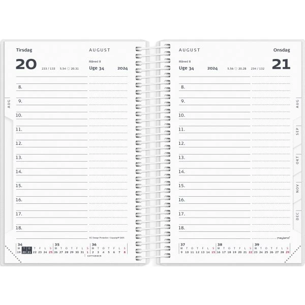 Du får her en smart, mini kalender med udskiftelig forside for året 2024. Kalenderen er inddelt med en dag pr. side og indeholder et timeopdelt kalenderskema fra kl. 8-18, så du nemt kan overskue dagens planer og aktiviteter. Dertil finder du en tidslinje og månedsoversigt nederst på hvert opslag, en udfoldelig årsoversigt over 2024 og 2025 samt masser af praktisk information.