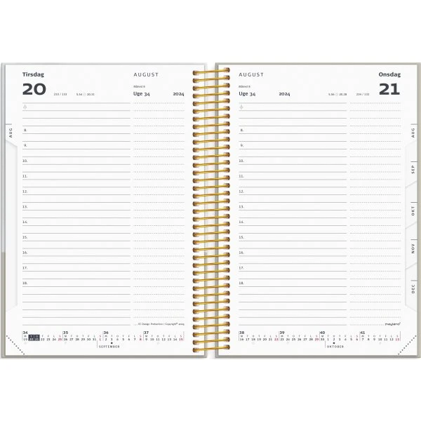 Du får her en stor dagkalender med en moderne forside for året 2024. Kalenderen er inddelt med en dag pr. side og indeholder et timeopdelt kalenderskema fra kl. 8-18, så du nemt kan danne dig et overblik over dagens planer og aftaler. Dertil finder du en tidslinje og månedsoversigt nederst på hvert opslag, en udfoldelig årsoversigt for 2024 og 2025, masser af praktisk information, stickerark samt en plastlomme til løse papirer bagerst i kalenderen.