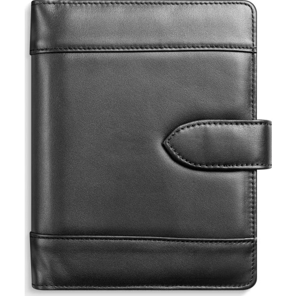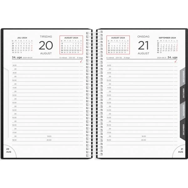 Du får her en stor, klassisk spiralkalender for året 2024. Kalenderen er spiralbundet med et omslag i hård PP-plast. Dertil medfølger et flot, løst kalenderomslag i ægte, sort skind, som har en fin lukkestrop samt lommer til kreditkort og løse papirer. Kalenderen er inddelt med en dag pr. side og indeholder et kalenderskema inddelt i halve timer fra kl. 8-20, så du nemt kan danne dig et overblik over dagens planer og aftaler.
