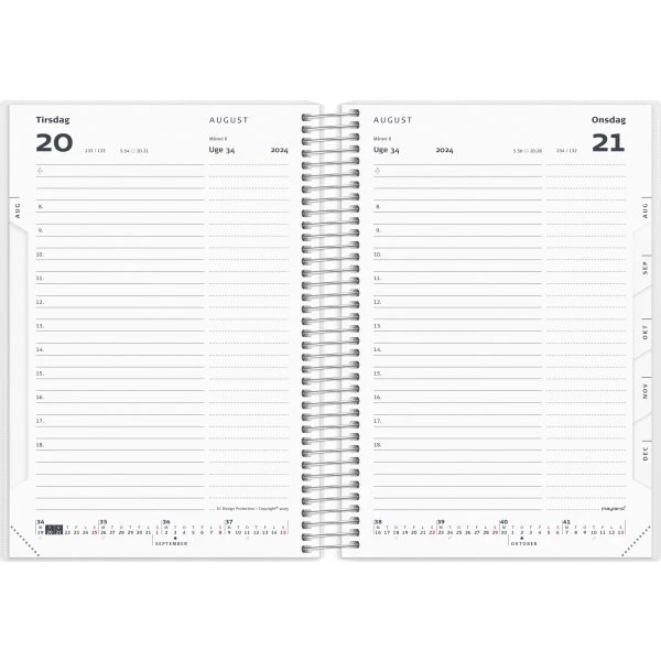Du får her en stor dagkalender med en udskiftelig forside for året 2024. Kalenderen er inddelt med en dag pr. side og indeholder et timeopdelt kalenderskema fra kl. 8-18, så du nemt kan danne dig et overblik over dagens planer og aftaler. Dertil finder du en tidslinje og månedsoversigt nederst på hvert opslag, en udfoldelig årsoversigt for 2024 og 2025, masser af praktisk information, stickerark samt en plastlomme til løse papirer bagerst i kalenderen.