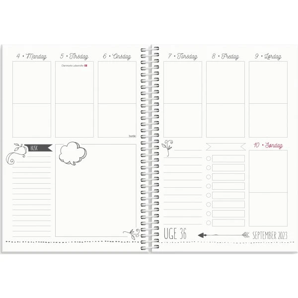 - Indeholder: Årsplan, stickersark, månedsoversigter, kvartalsoversigter, prikkede sider og linjerede sider