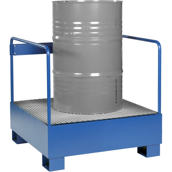 Miljøstativ med gelænder til sikker opbevaring af tønder og andet materiale, der kan indeholde f.eks. kemikalier.