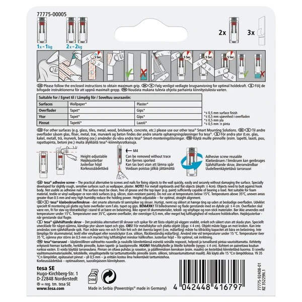 Lad være med at bruge tid og kræfter på at bore huller i væggen. Med tesa® klæbeskruer sikrer du en nem, bekvem og pålidelig montering, der er skånsomme og ikke skader strukturerede og sarte overflader som tapet og gips. Om du skal hænge pyntegenstande, billeder, hylder eller andre ting og sager op indendørs, er disse klæbeskruer perfekte alternativer til søm og skruer.